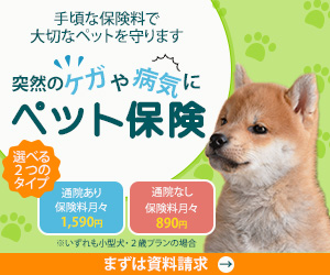 架空のペット保険のバナーを制作しました。 画像は子犬を使用し、背景も犬の足跡で揃えました。2つの金額のプランを記載し、資料請求をしたくなるデザインにしました。